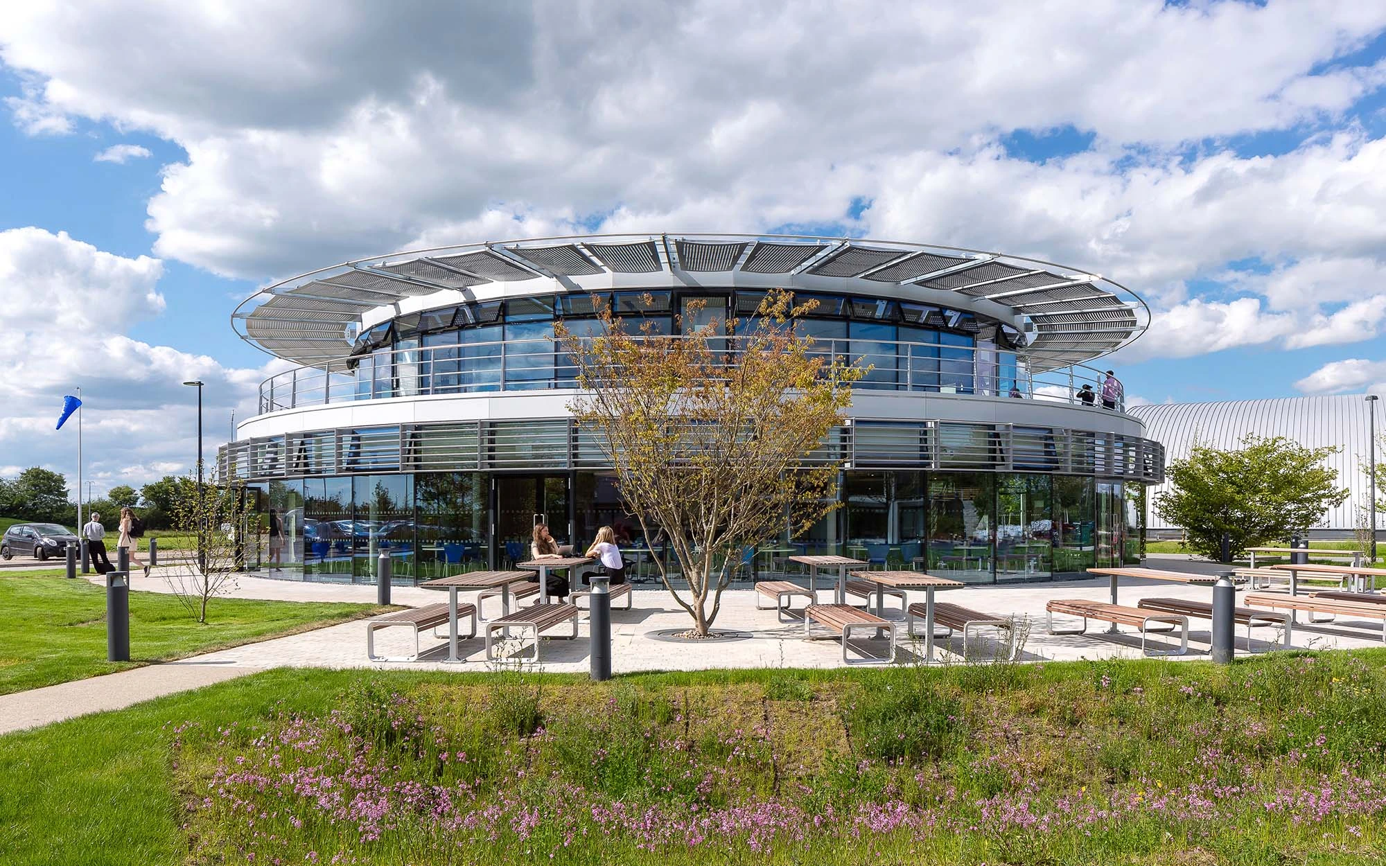 The Roundhouse, designed as a social space for students, is conceived as a freestanding, transparent and outward-facing circular pavilion. The lightweight steel structure is formed of two stacked cylinders, surmounted by an oversailing brise soleil roof. Designed to mediate between the accommodation clusters and the wider Dyson campus, it is divided into the southern side - transparent and social, and the northern side, which is metal-clad and functional. Its facilities include a café, bar, lecture hall and study space.