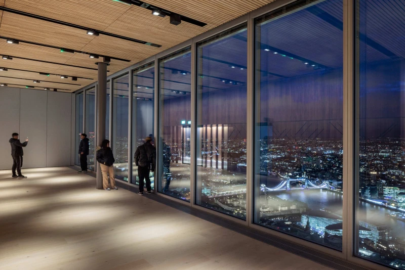 The pavilion, the uppermost block in the building, contains the public viewing gallery with magnificent views across London. A separate entrance lobby at ground level provides public access to dedicated lifts that rise to the full height of the building.
