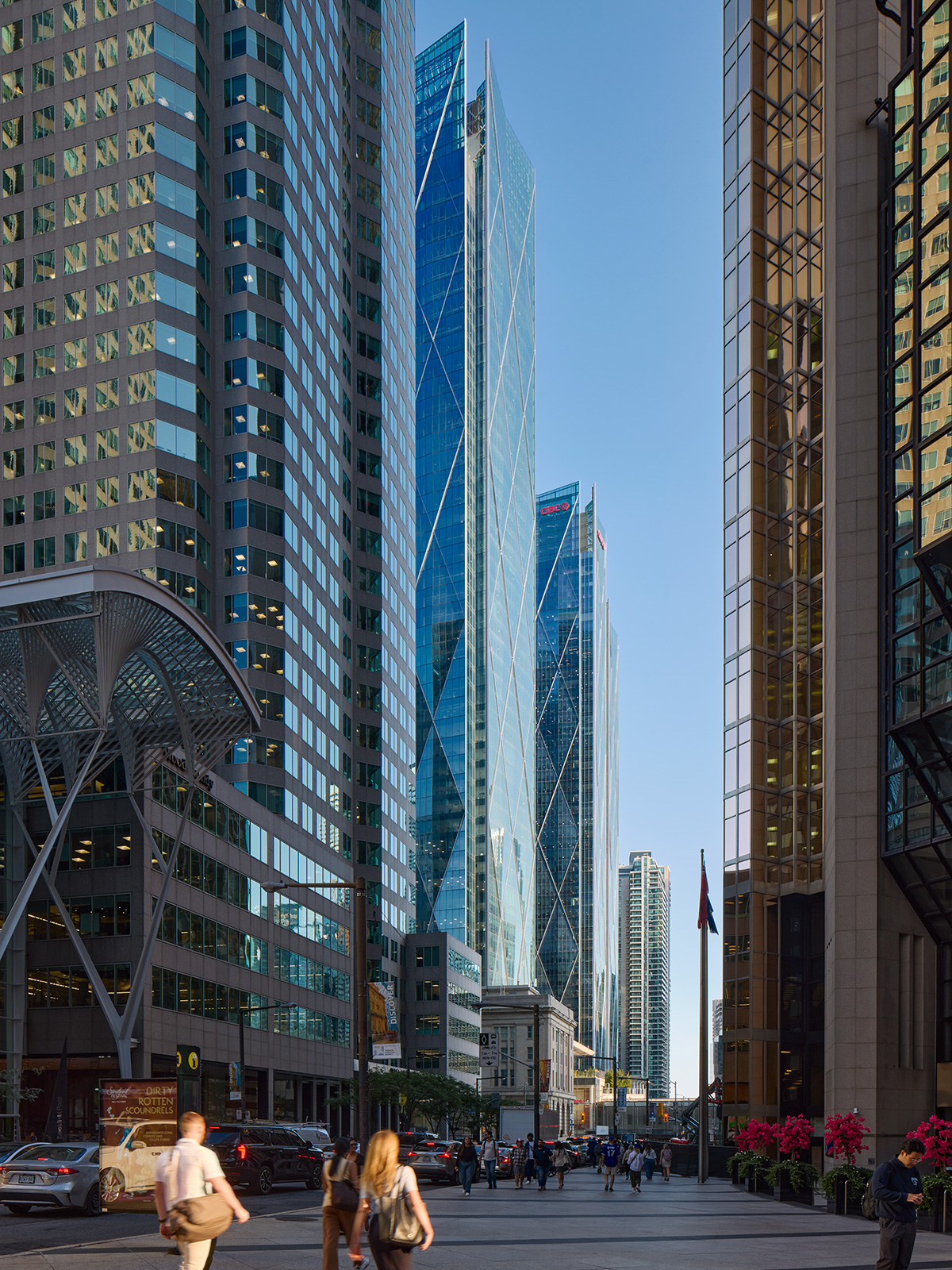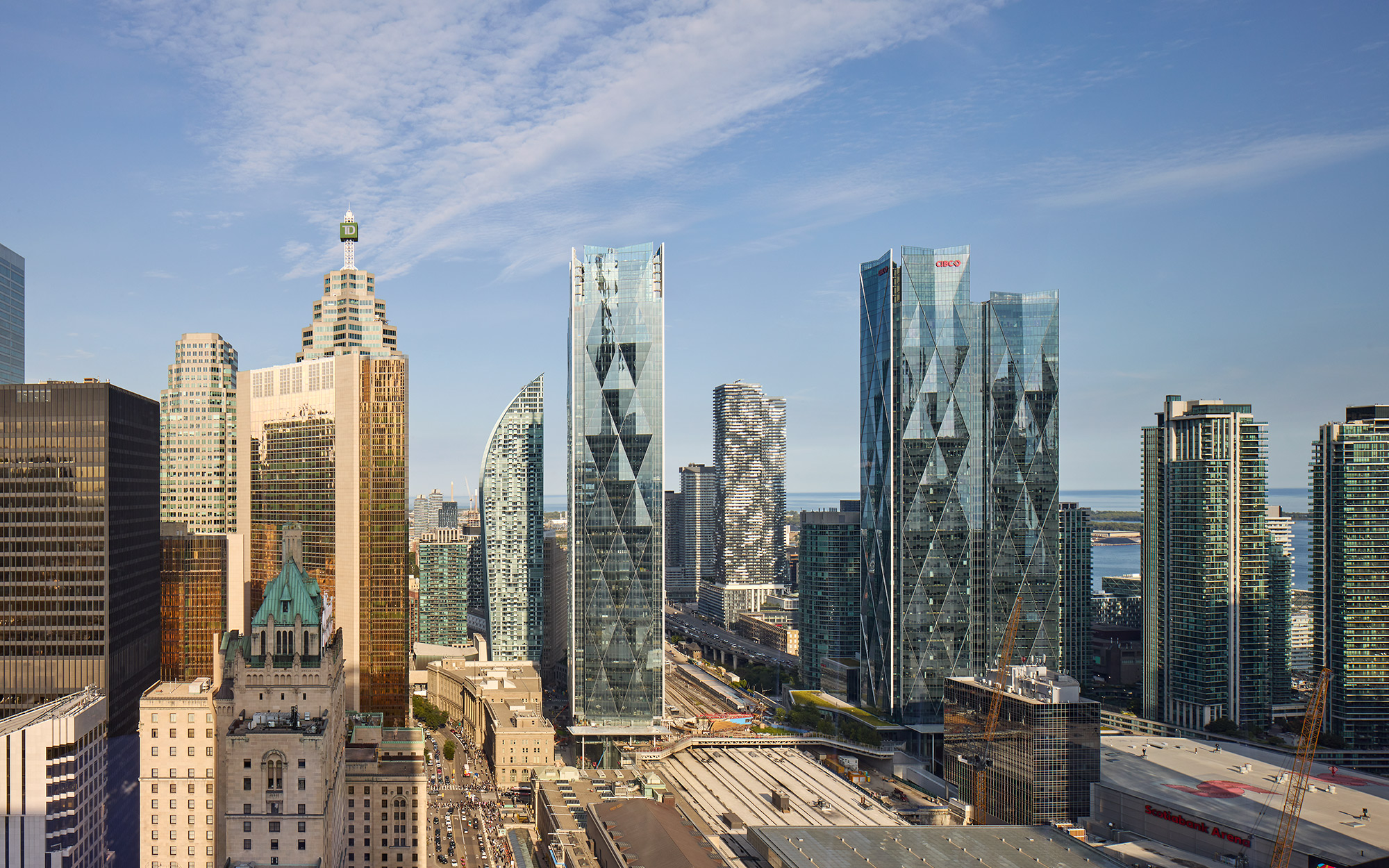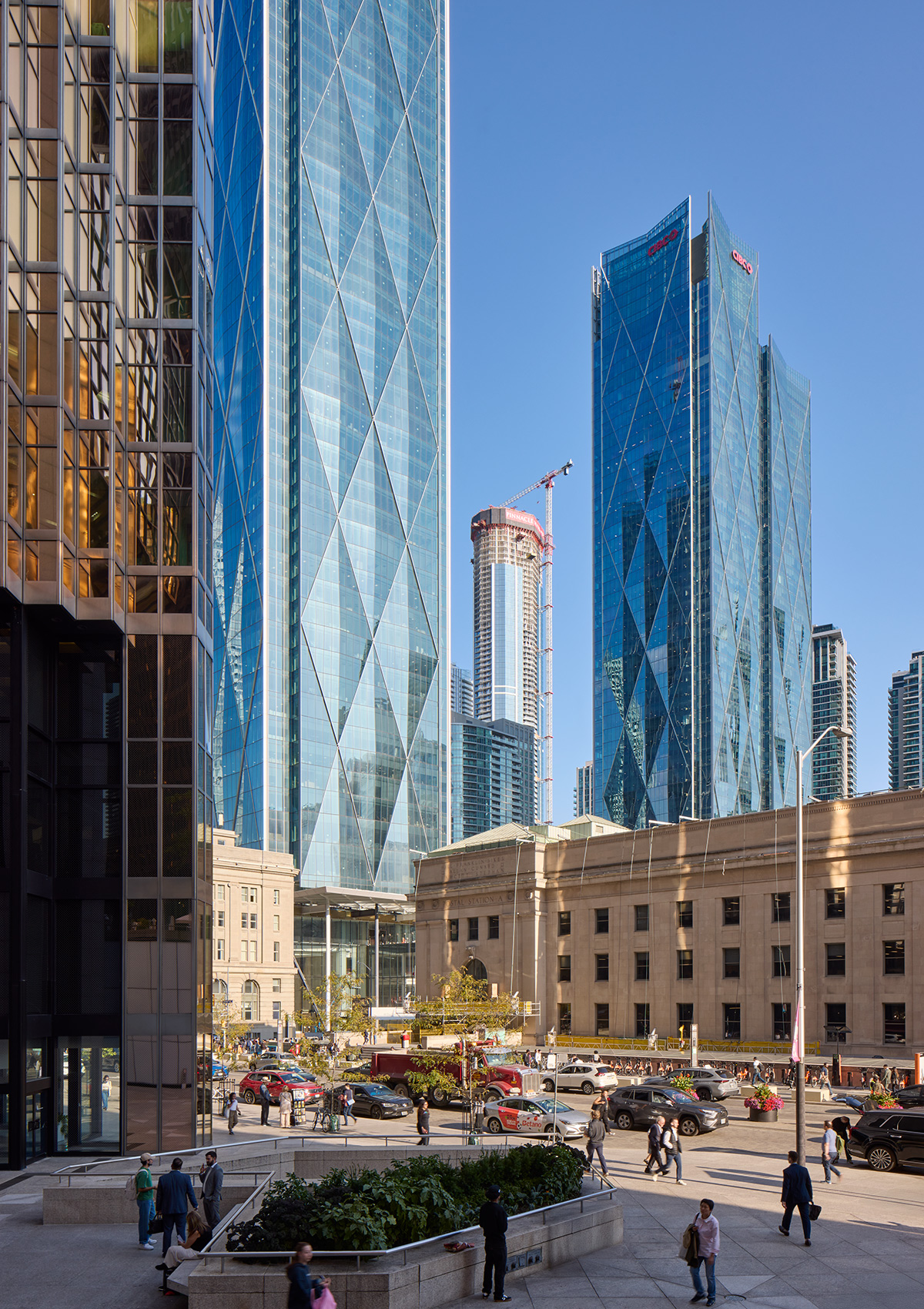 Both towers feature a lightly folded glazed façade, creating a diamond pattern that repeats every ten storeys, adding a vertical scale and modulation contrasting with the surrounding buildings. The construction of 81 Bay Street began in June 2017 and was completed in 2021. The overall development, with CIBC as the anchor tenant, is due for completion by 2025.