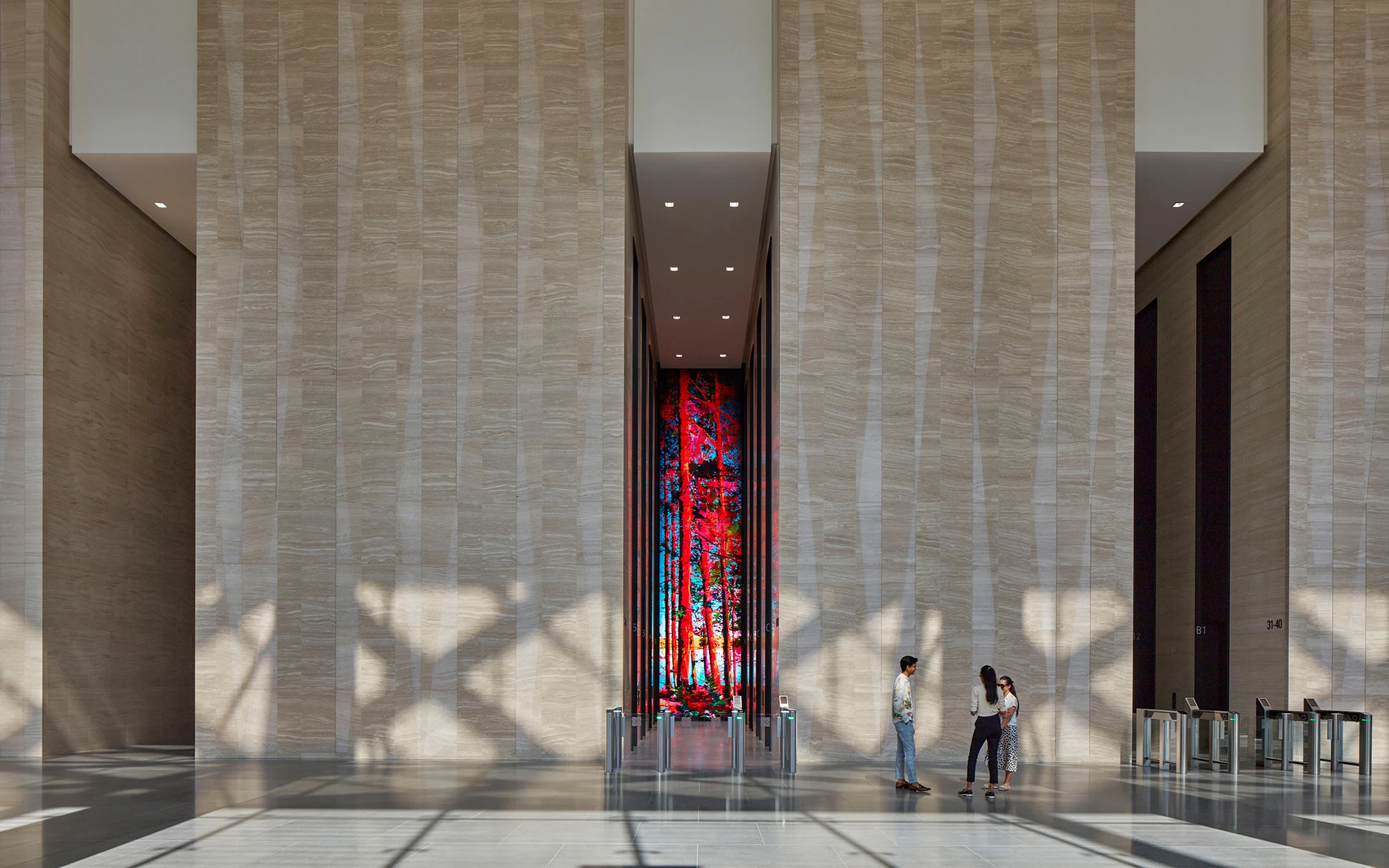 Integrated into the recess of the six elevator bays and visible from the street, softly backlit glass panels 11m high depict tall trees in a lakeside setting, realised in rich colours and deep shadow.