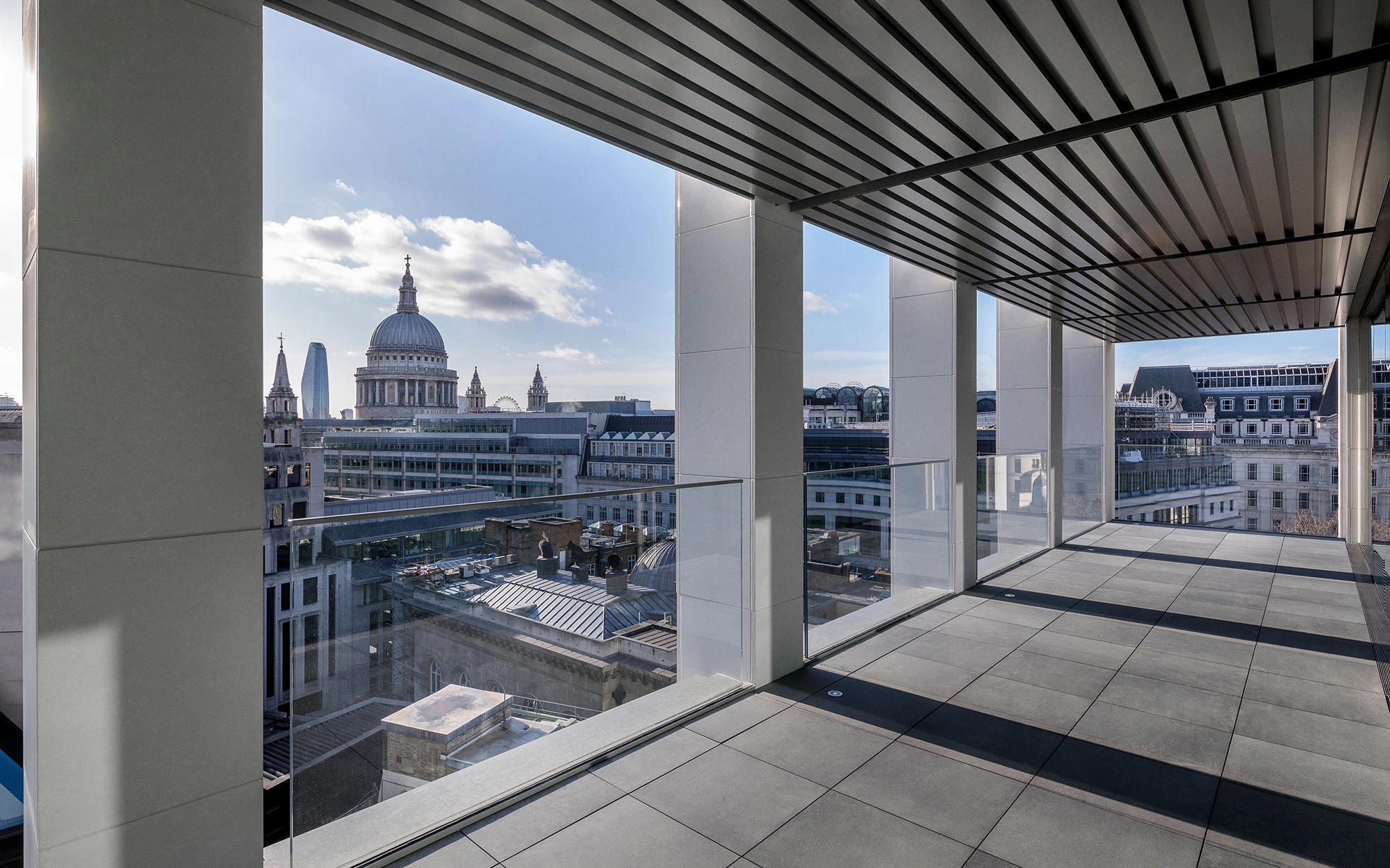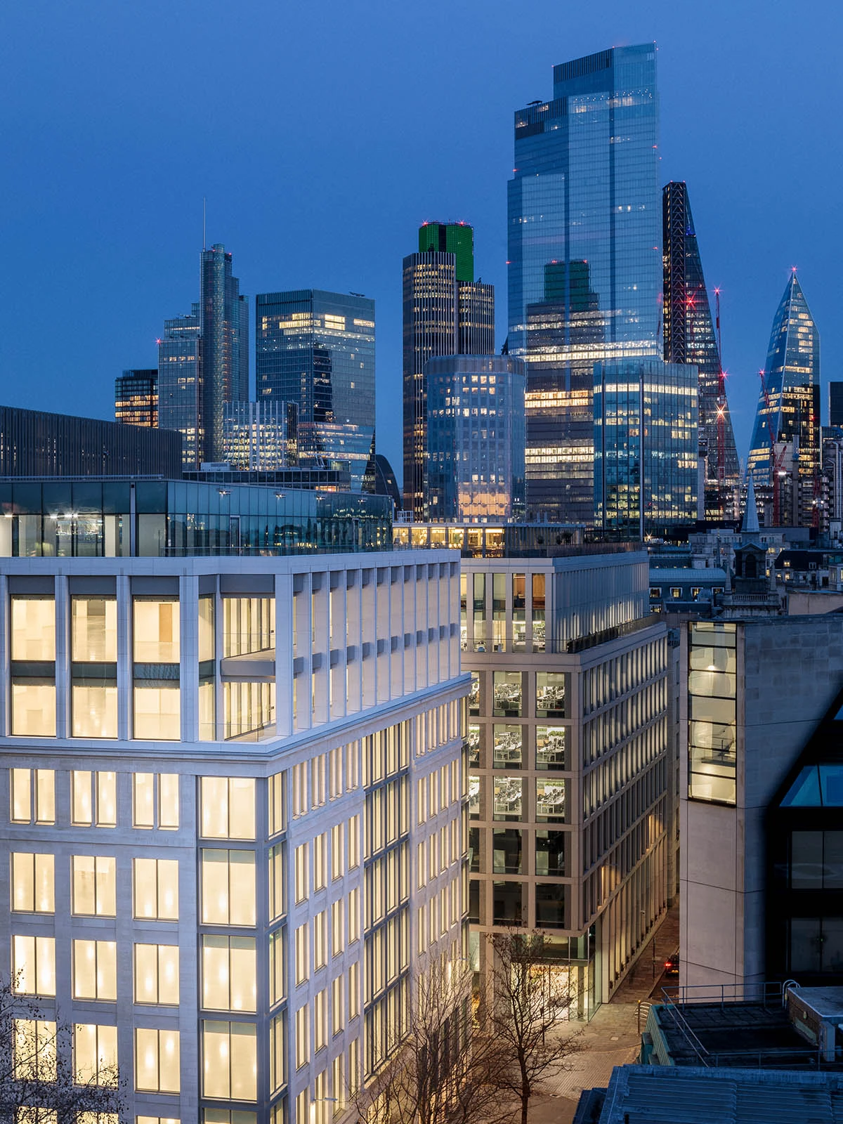 Two existing levels have been rebuilt and an additional level added, optimising the footprint within a context of strict planning controls. The stepped design of the upper levels provided the opportunity to create landscaped roof terraces with extensive views of the nearby St Paul’s Cathedral and across the City of London. High-quality external façade choices including new natural stone elements complement the original Portland Stone facades.