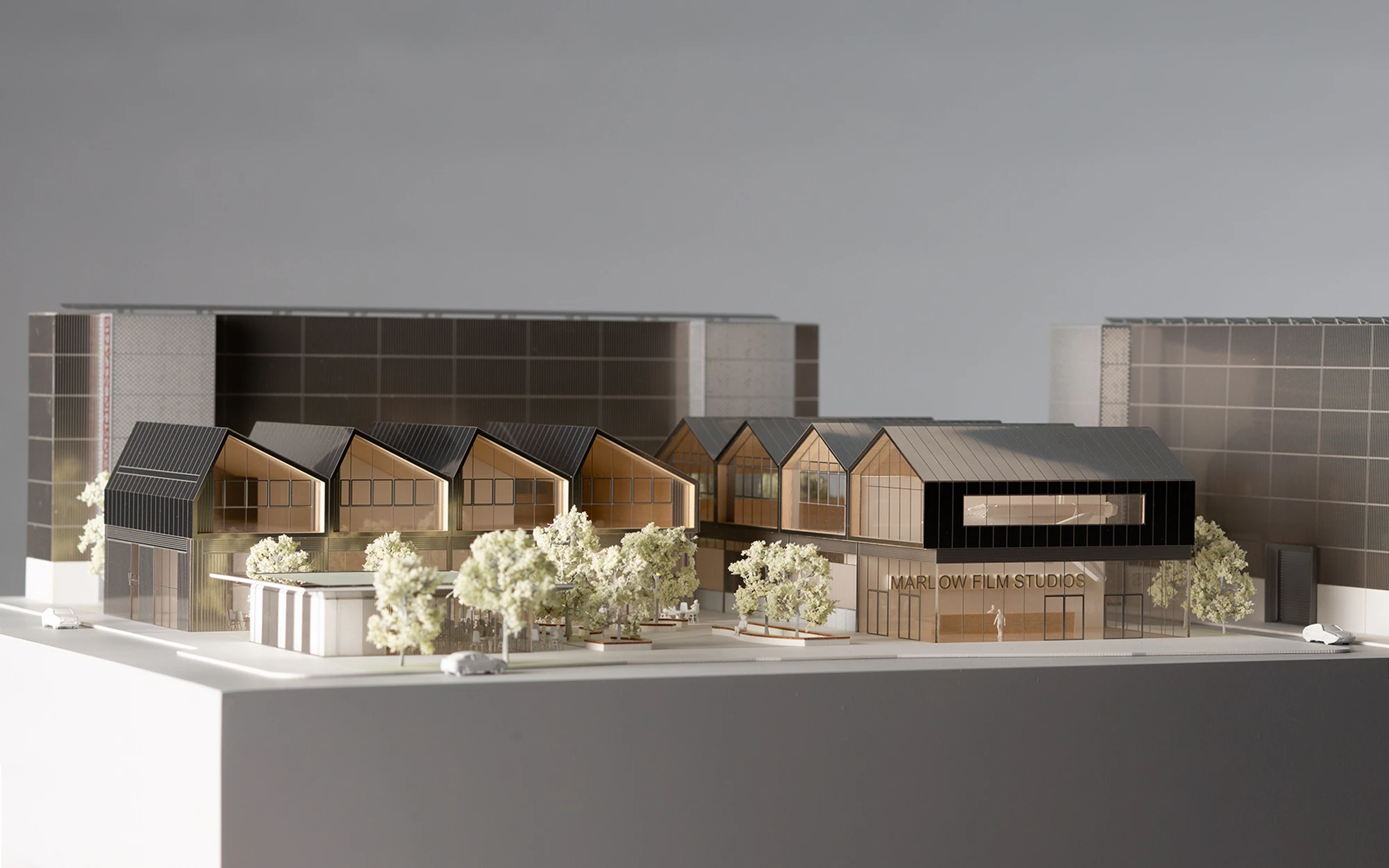 The production units consist of a range of single-storey, large-volume sound stages with the smaller, supporting workshops and offices strategically positioned around them to help screen the larger stages and reduce the perceived scale of the site.
