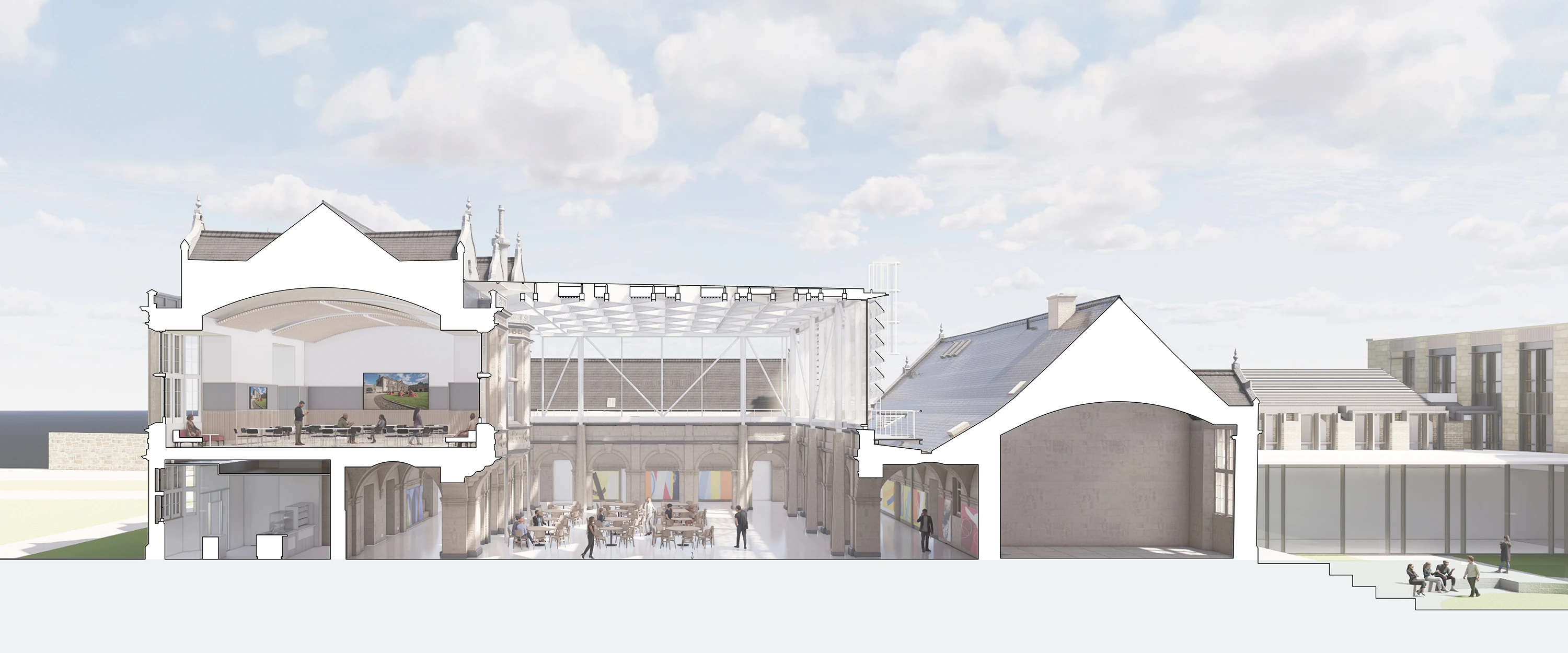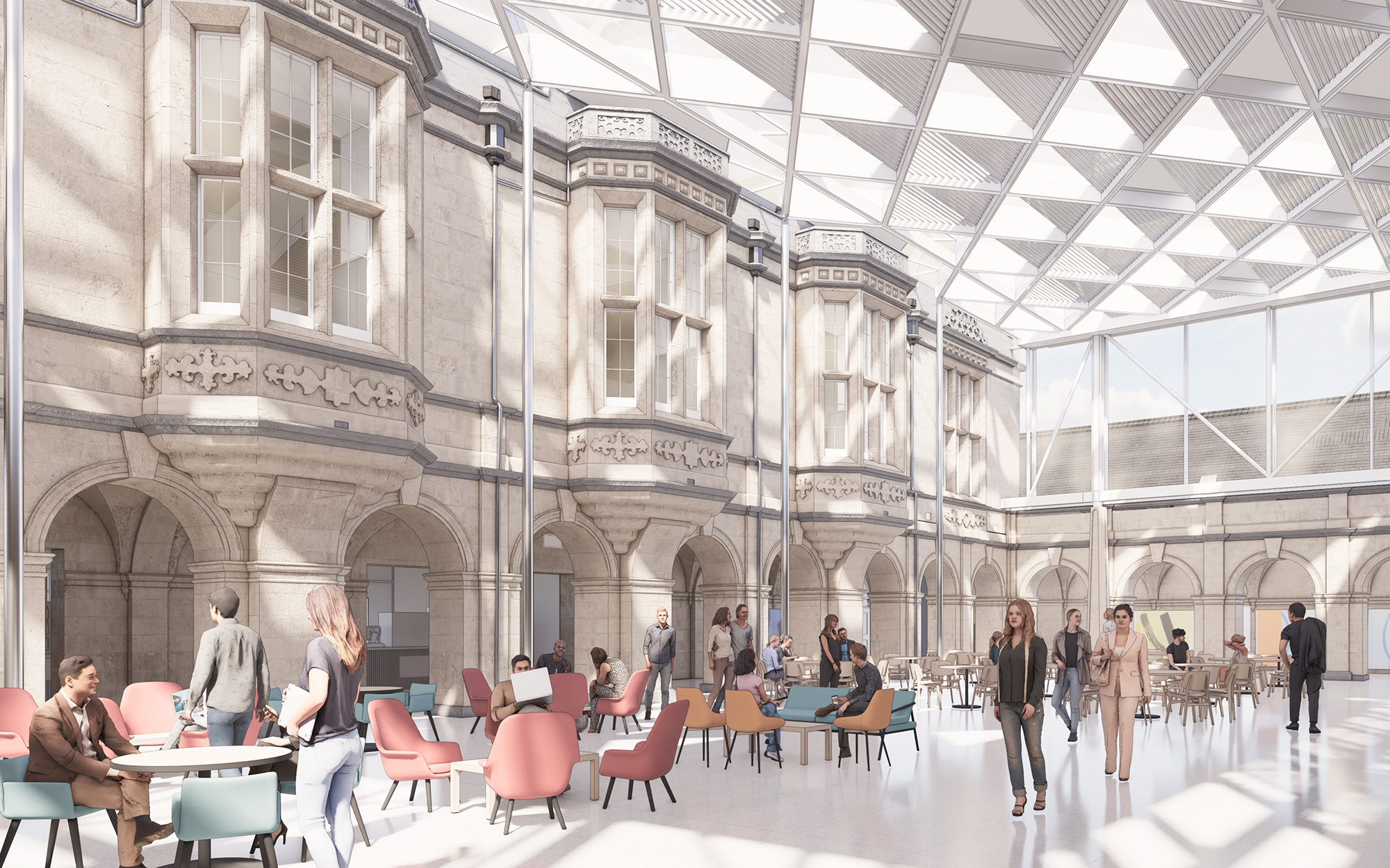 Renovation plans include a glass roof over the quad to preserve the sandstone cloister beneath and provide a large indoor space to be enjoyed by students, staff and visitors alike. There will also be a significant new building to the rear of the historic frontage. In addition to lecture theatres, meeting rooms, study space and conference areas, New College will feature community spaces, including a café and a Changing Places facility.
