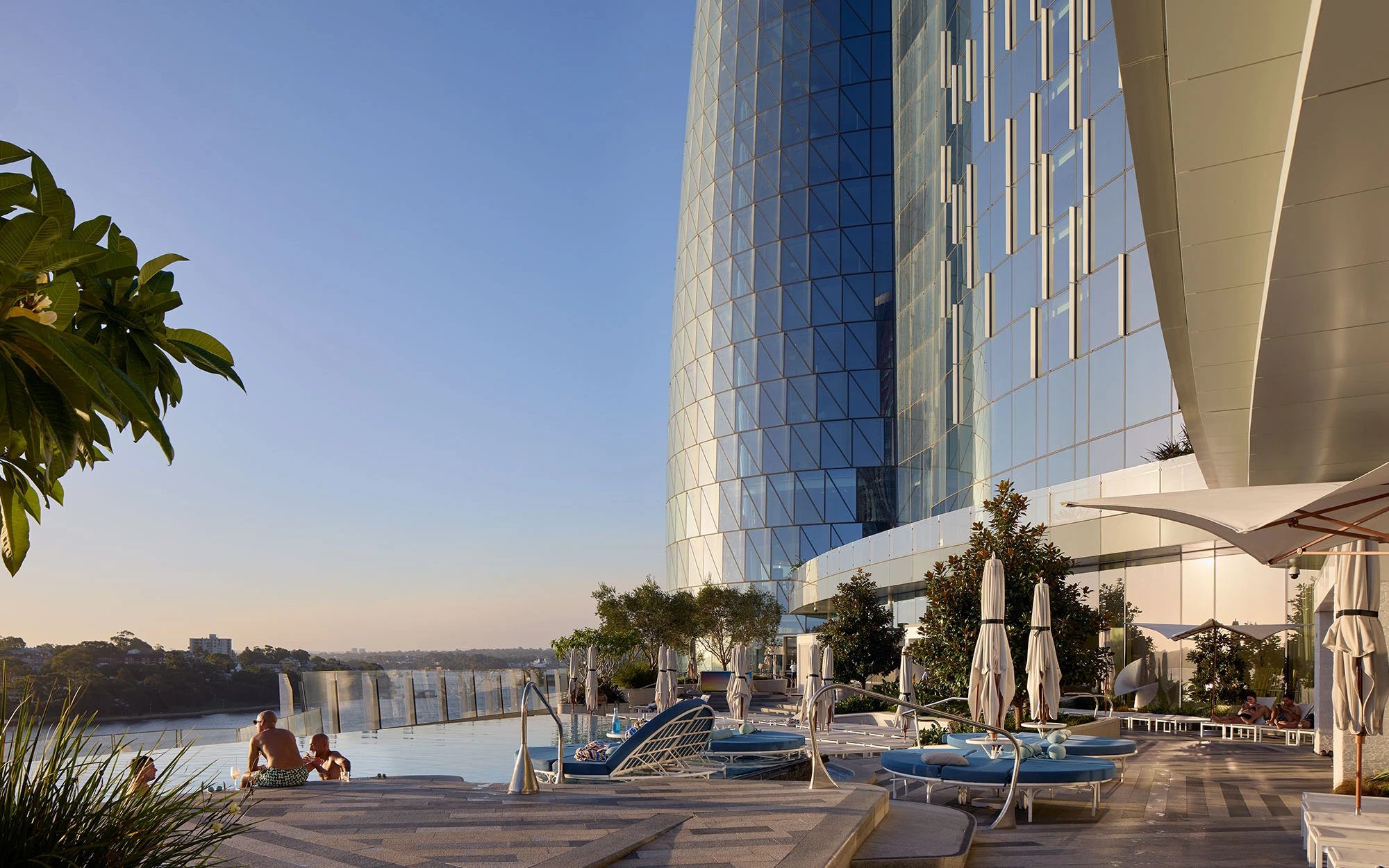 Many of the city's most well-known buildings are situated along the waterfront, Jørn Utzon’s Sydney Opera House being the most famous. The hotel is a little further along on the Barangaroo waterfront in East Darling Harbour. Central to the design of the hotel is the idea that it should be a sculptural form contrasting with the more orthogonal geometry of the tall buildings in the central business district.