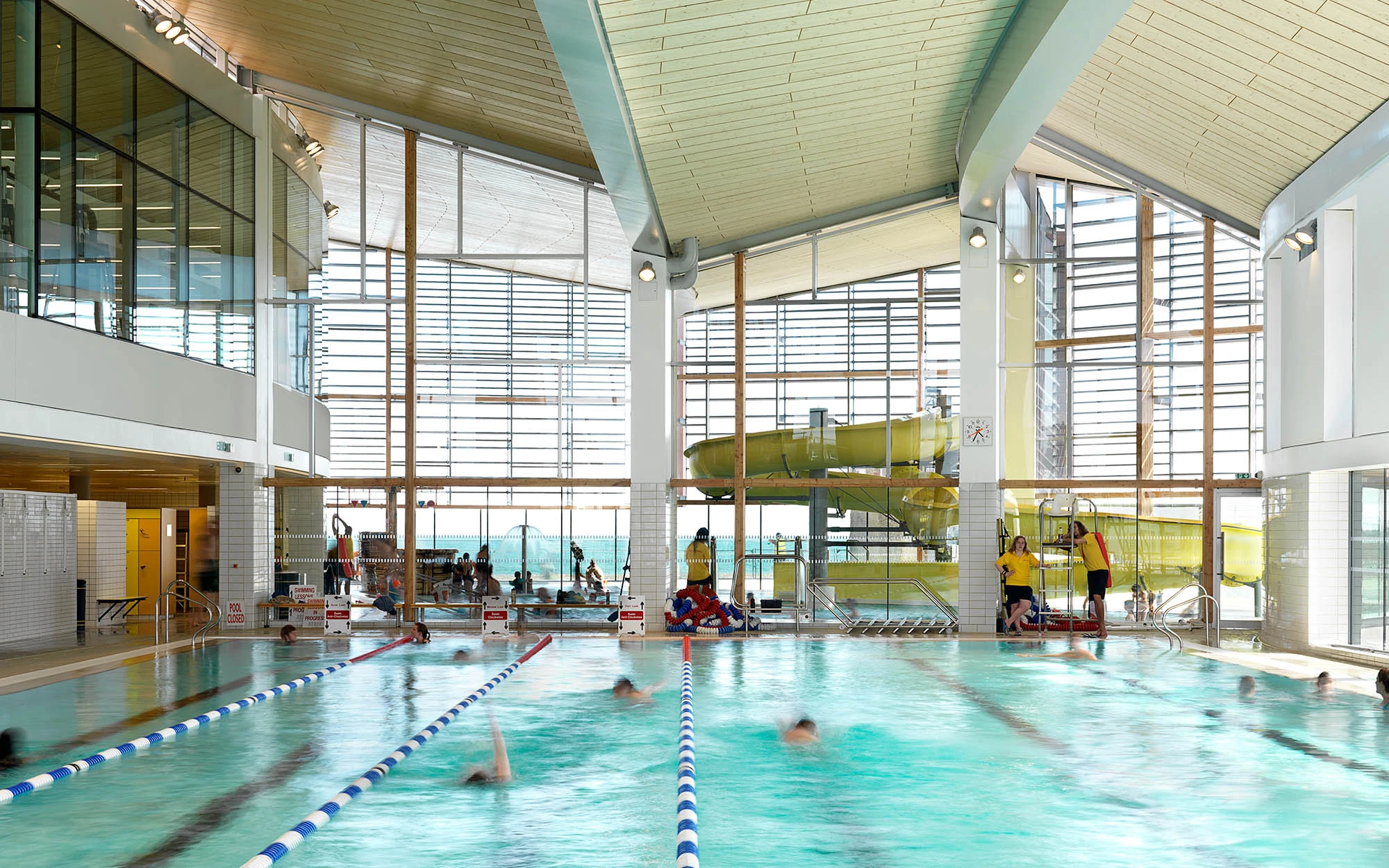 WilkinsonEyre was appointed to design this new swimming pool for Worthing Borough Council following an RIBA competition. The new complex includes a six-lane, 25-metre pool, a combined learner/diving pool, indoor leisure pools with rapids, flumes and outdoor waters, a health and fitness centre, café, crèche and flexible space for other activities.