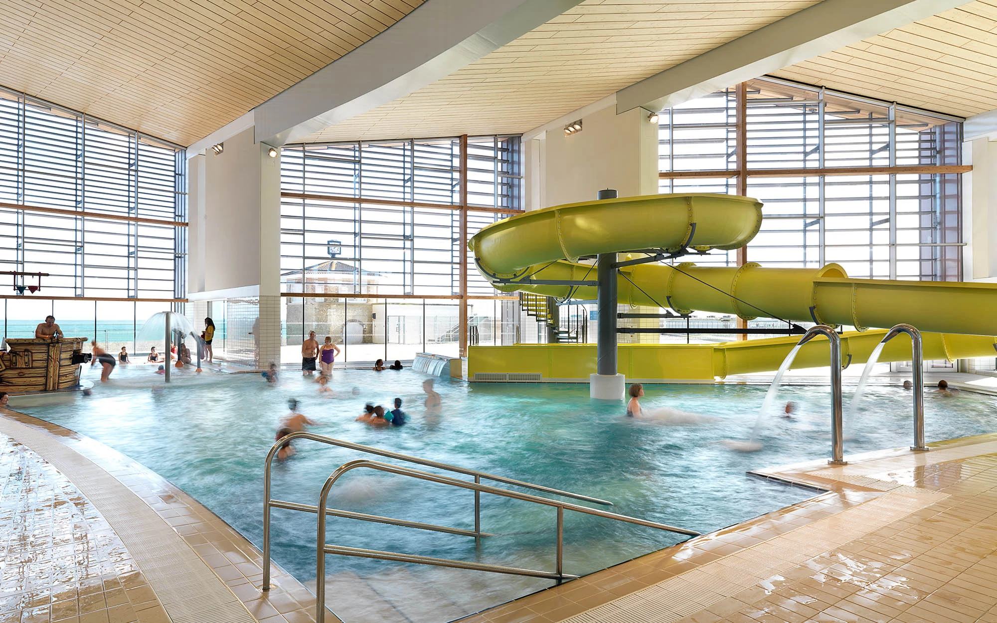 The main pool hall acts as a viewfinder, connecting the street with the seafront, and the building terminates in a series of glazed façades directly overlooking the water. This device creates a striking internal space awash with natural daylight. The environment was challenging – the saline coastal air, coupled with the humid pool area called for a resilient palette of materials.