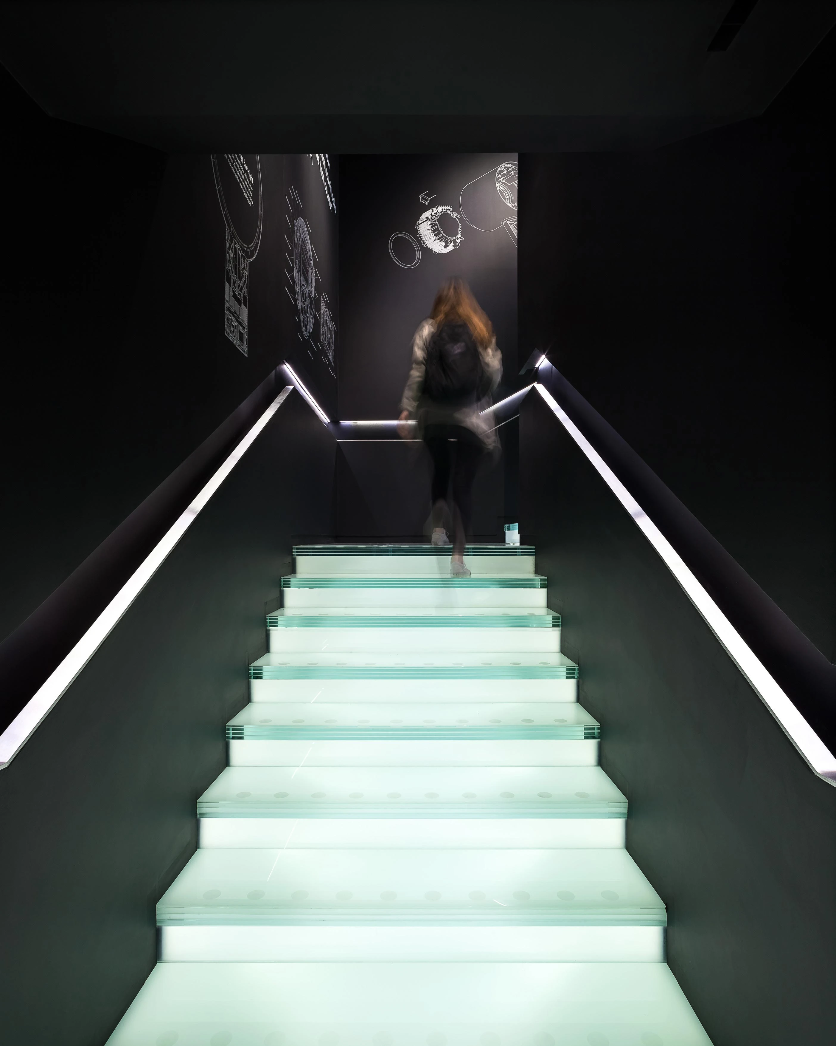 Products are presented on plinths like artworks, while technical information is communicated on video walls. Customers are able to access a wide variety of information, from the initial conceptual sketches to details of the innovative technology printed onto the surrounding walls.