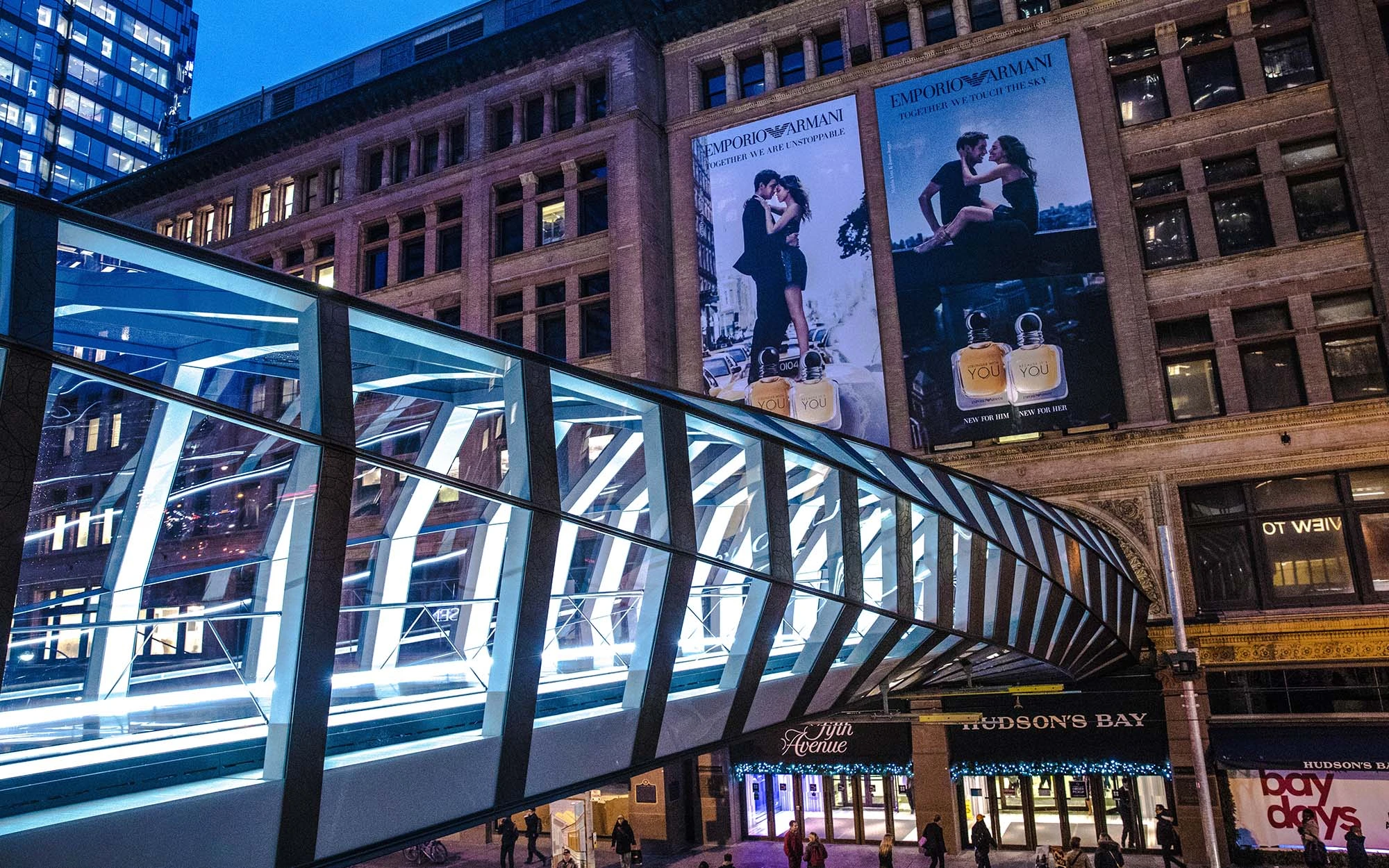 调整后的天桥线位带来了许多优点,包括提高人行流线的效率,为访客提供更愉快的体验,并最小化过桥的坡度。桥梁的形态和材料在二层立面上创造了象征性的“握手”效果,将两座建筑联系在一起。桥梁通过几何设计,从哈德逊湾中心建筑立面上的传统拱门逐渐过渡到伊顿中心中的现代矩形开口;桥梁扭曲的形式融合了两种不同的建筑风格。
